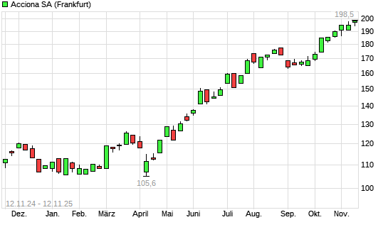 Mit dem Anstieg auf 198,10 EUR hat die Acciona-Aktie (ISIN ES0125220311) am 11.11.2025 ein neues 3-Jahres-Hoch erreicht und damit den Kurs vom 05.11.2025 eingestellt.