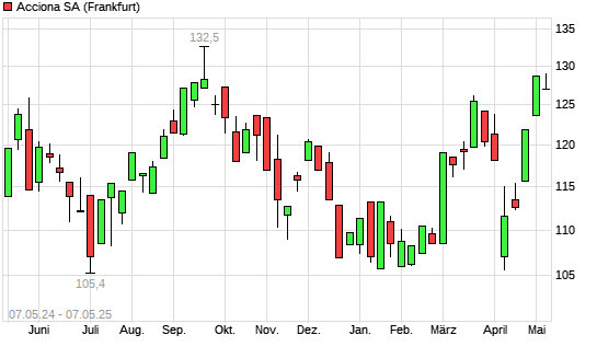 Mit dem Anstieg auf 129,00 EUR hat die Acciona-Aktie (ISIN ES0125220311) am 06.05.2025 ein neues 6-Monats-Hoch erreicht und damit den Kurs vom 02.05.2025 eingestellt.