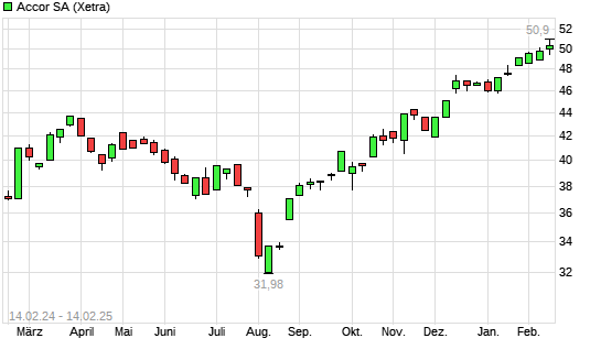 Mit dem Anstieg auf 50,98 EUR hat die Accor-Aktie (ISIN FR0000120404) am 13.02.2025 ein neues 5-Jahres-Hoch erreicht und damit den Kurs vom 11.02.2025 eingestellt.