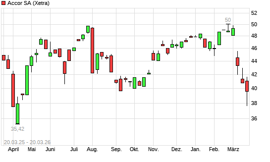 Mit dem Rücksetzer auf 38,08 EUR hat die Accor-Aktie (ISIN FR0000120404) am 19.03.2026 ein neues 6-Monats-Tief erreicht und damit den Kurs vom 25.09.2025 eingestellt.