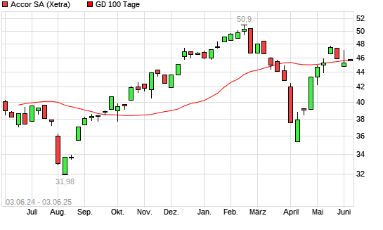 Mit dem Rücksetzer auf 45,15 EUR hat die Accor-Aktie am 02.06.2025 die 100-Tage-Linie nach unten gekreuzt.