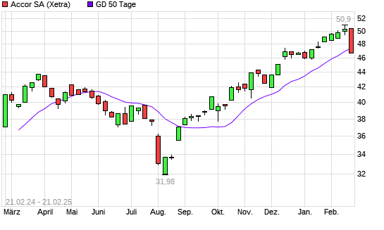Mit dem Rücksetzer auf 47,00 EUR hat die Accor-Aktie am 20.02.2025 die 50-Tage-Linie nach unten gekreuzt.