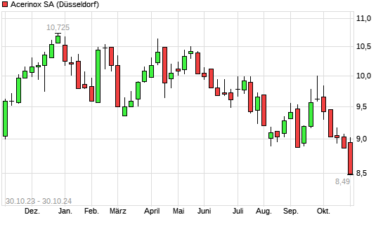 Mit dem Rücksetzer auf 8,53 EUR hat die Acerinox-Aktie (ISIN ES0132105018) am 29.10.2024 ein neues 12-Monats-Tief erreicht und damit den Kurs vom 06.09.2024 eingestellt.