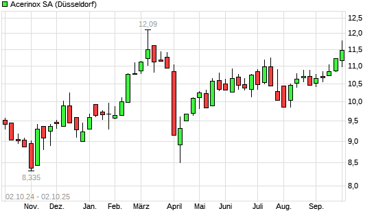 Mit dem Anstieg auf 11,58 EUR hat die Acerinox-Aktie (ISIN ES0132105018) am 01.10.2025 ein neues 6-Monats-Hoch erreicht und damit den Kurs vom 15.07.2025 eingestellt.