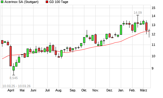 Mit dem Rücksetzer auf 12,10 EUR hat die Acerinox-Aktie am 09.03.2026 die 100-Tage-Linie nach unten gekreuzt.
