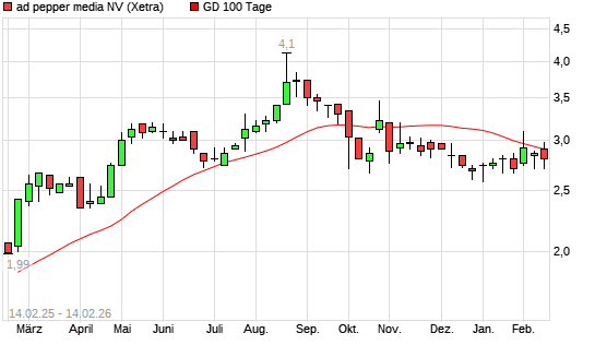Mit dem Rücksetzer auf 2,56 EUR hat die Ad Pepper Media-Aktie am 13.02.2026 die 100-Tage-Linie nach unten gekreuzt.