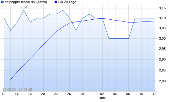 Mit dem Rücksetzer auf 3,00 EUR hat die Ad Pepper Media-Aktie am 11.06.2025 die 20-Tage-Linie nach unten gekreuzt.