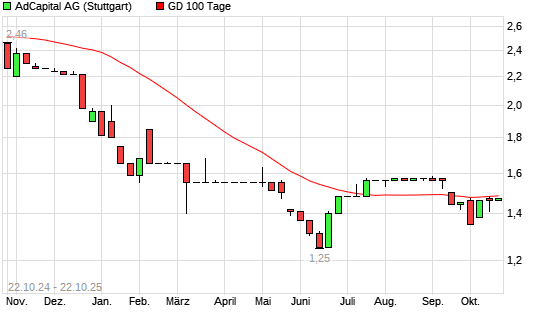 Mit dem Rücksetzer auf 1,47 EUR hat die AdCapital-Aktie am 21.10.2025 die 100-Tage-Linie nach unten gekreuzt.