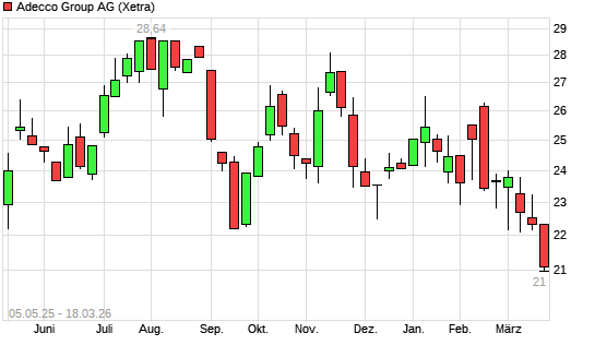 Mit dem Rücksetzer auf 21,00 EUR hat die Adecco-Aktie (ISIN CH0012138605) am 17.03.2026 ein neues 10-Jahres-Tief erreicht und damit den Kurs vom 10.01.2025 eingestellt.