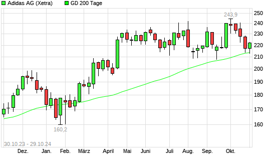 Mit dem Rücksetzer auf 213,70 EUR hat die Adidas-Aktie am 28.10.2024 die 200-Tage-Linie nach unten gekreuzt.