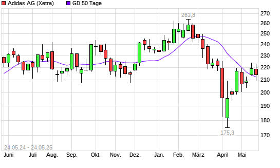 Mit dem Rücksetzer auf 211,40 EUR hat die Adidas-Aktie am 23.05.2025 die 50-Tage-Linie nach unten gekreuzt.