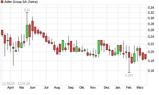 Mit dem Rücksetzer auf 0,17 EUR hat die Adler-Aktie (ISIN LU1250154413) am 11.03.2026 ein neues 12-Monats-Tief erreicht und damit den Kurs vom 10.03.2026 eingestellt.