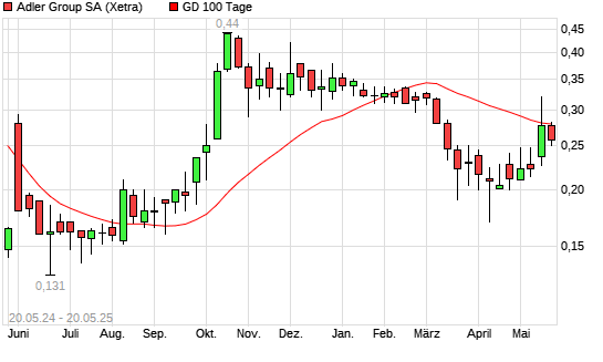 Mit dem Anstieg auf 0,28 EUR hat die Adler-Aktie am 19.05.2025 die 100-Tage-Linie nach oben gekreuzt.
