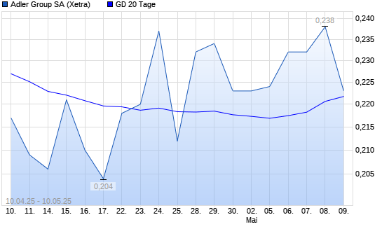 Mit dem Rücksetzer auf 0,22 EUR hat die Adler-Aktie am 09.05.2025 die 20-Tage-Linie nach unten gekreuzt.
