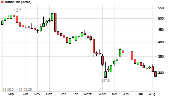 Mit dem Rücksetzer auf 288,10 EUR hat die Adobe-Aktie (ISIN US00724F1012) am 07.08.2025 ein neues 12-Monats-Tief erreicht und damit den Kurs vom 04.08.2025 eingestellt.