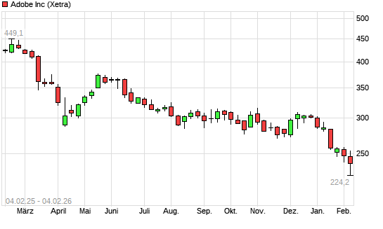 Mit dem Rücksetzer auf 230,15 EUR hat die Adobe-Aktie (ISIN US00724F1012) am 03.02.2026 ein neues 5-Jahres-Tief erreicht und damit den Kurs vom 29.01.2026 eingestellt.