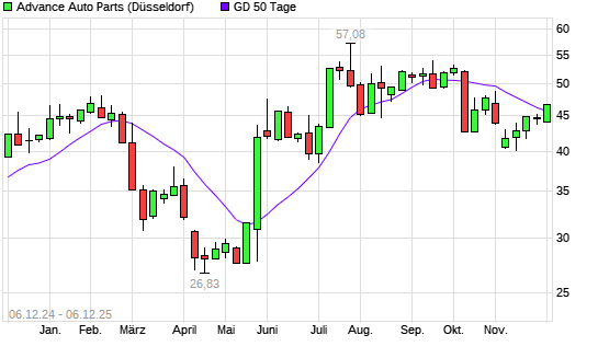 Mit dem Rücksetzer auf 44,83 EUR hat die Advance Auto Parts-Aktie am 05.12.2025 die 50-Tage-Linie nach unten gekreuzt.
