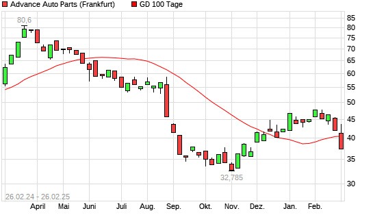 Mit dem Rücksetzer auf 40,68 EUR hat die Advance Auto Parts-Aktie am 25.02.2025 die 100-Tage-Linie nach unten gekreuzt.Die Advance Auto Parts-Aktie befindet sich seit dem 26.06.2024 im ...weiterlesen