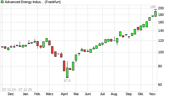 Mit dem Anstieg auf 195,00 EUR hat die Advanced Energy Industries-Aktie (ISIN US0079731008) am 06.11.2025 ein neues All-Time-High erreicht und damit den Kurs vom 30.10.2025 eingestellt.