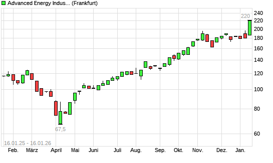 Mit dem Anstieg auf 202,00 EUR hat die Advanced Energy Industries-Aktie (ISIN US0079731008) am 15.01.2026 ein neues All-Time-High erreicht und damit den Kurs vom 14.01.2026 eingestellt.