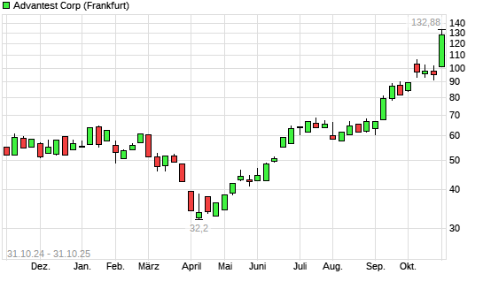 Mit dem Anstieg auf 127,98 EUR hat die Advantest-Aktie (ISIN JP3122400009) am 30.10.2025 ein neues All-Time-High erreicht und damit den Kurs vom 29.10.2025 eingestellt.