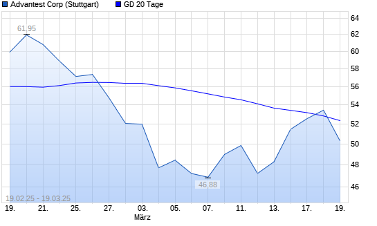 Mit dem Anstieg auf 52,45 EUR hat die Advantest-Aktie am 18.03.2025 die 20-Tage-Linie nach oben gekreuzt.