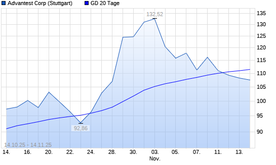 Mit dem Rücksetzer auf 110,50 EUR hat die Advantest-Aktie am 13.11.2025 die 20-Tage-Linie nach unten gekreuzt.