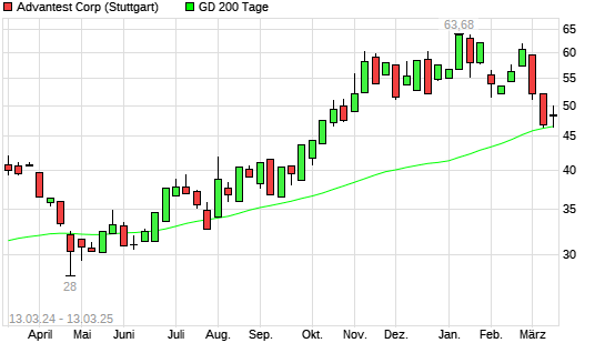 Mit dem Rücksetzer auf 46,04 EUR hat die Advantest-Aktie am 12.03.2025 die 200-Tage-Linie nach unten gekreuzt.