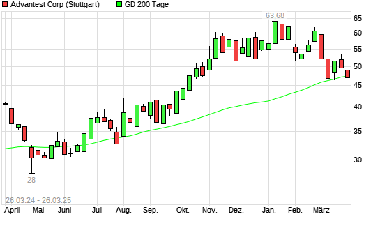 Mit dem Rücksetzer auf 46,88 EUR hat die Advantest-Aktie am 25.03.2025 die 200-Tage-Linie nach unten gekreuzt.