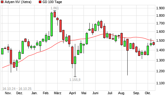 Mit dem Rücksetzer auf 1.459,80 EUR hat die Adyen-Aktie am 15.10.2025 die 100-Tage-Linie nach unten gekreuzt.