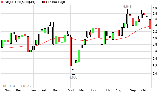 Mit dem Rücksetzer auf 6,19 EUR hat die Aegon-Aktie am 17.10.2025 die 100-Tage-Linie nach unten gekreuzt.