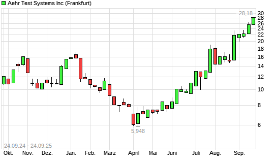 Mit dem Anstieg auf 27,38 EUR hat die Aehr Test Systems-Aktie (ISIN US00760J1088) am 23.09.2025 ein neues 12-Monats-Hoch erreicht und damit den Kurs vom 19.09.2025 eingestellt.