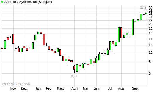 Mit dem Anstieg auf 28,00 EUR hat die Aehr Test Systems-Aktie (ISIN US00760J1088) am 02.10.2025 ein neues 12-Monats-Hoch erreicht und damit den Kurs vom 24.09.2025 eingestellt.