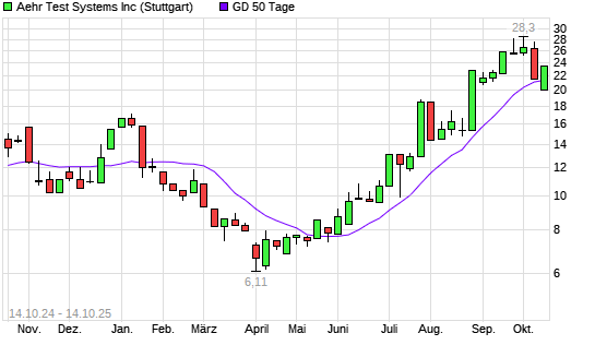 Mit dem Rücksetzer auf 20,37 EUR hat die Aehr Test Systems-Aktie am 13.10.2025 die 50-Tage-Linie nach unten gekreuzt.