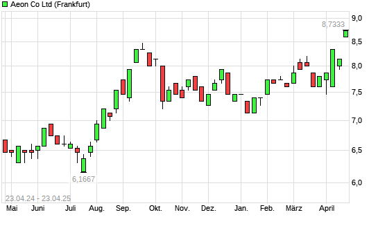Mit dem Anstieg auf 25,80 EUR hat die Aeon-Aktie (ISIN JP3388200002) am 22.04.2025 ein neues 3-Jahres-Hoch erreicht und damit den Kurs vom 17.09.2024 eingestellt.
