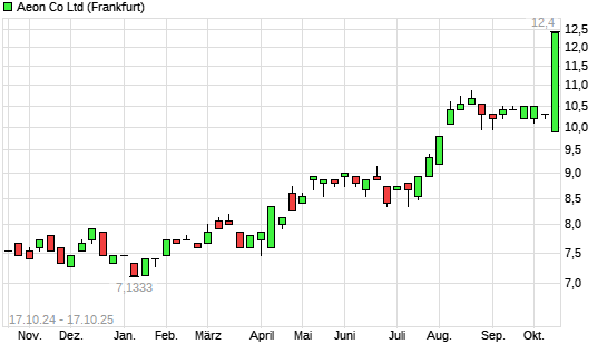 Mit dem Anstieg auf 11,90 EUR hat die Aeon-Aktie (ISIN JP3388200002) am 16.10.2025 ein neues All-Time-High erreicht und damit den Kurs vom 15.10.2025 eingestellt.