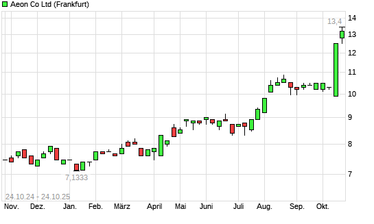 Mit dem Anstieg auf 13,40 EUR hat die Aeon-Aktie (ISIN JP3388200002) am 23.10.2025 ein neues All-Time-High erreicht und damit den Kurs vom 22.10.2025 eingestellt.Die Aeon-Aktie befindet sich ...weiterlesen