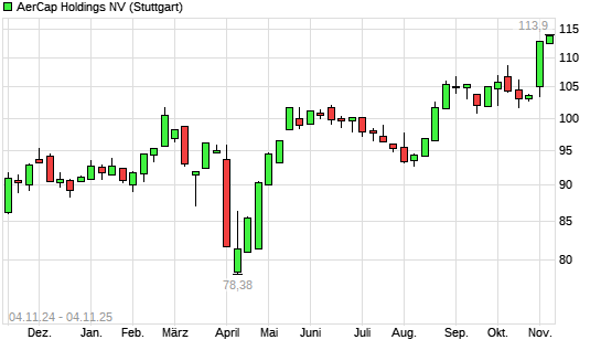 Mit dem Anstieg auf 113,50 EUR hat die Aercap Holdings-Aktie (ISIN NL0000687663) am 03.11.2025 ein neues All-Time-High erreicht und damit den Kurs vom 29.10.2025 eingestellt.