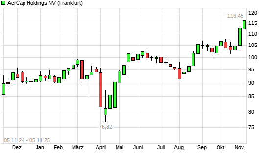 Mit dem Anstieg auf 113,95 EUR hat die Aercap Holdings-Aktie (ISIN NL0000687663) am 04.11.2025 ein neues All-Time-High erreicht und damit den Kurs vom 03.11.2025 eingestellt.
