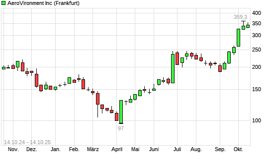 Mit dem Anstieg auf 353,70 EUR hat die AeroVironment-Aktie (ISIN US0080731088) am 13.10.2025 ein neues All-Time-High erreicht und damit den Kurs vom 08.10.2025 eingestellt.