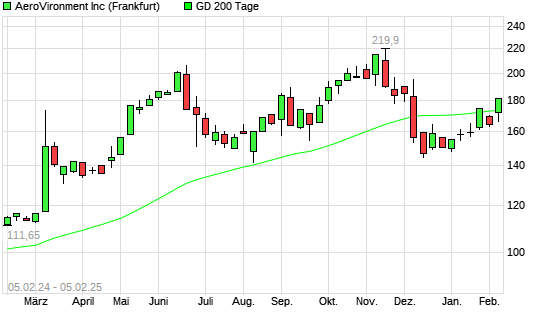 Mit dem Anstieg auf 180,00 EUR hat die AeroVironment-Aktie am 04.02.2025 die 200-Tage-Linie nach oben gekreuzt.