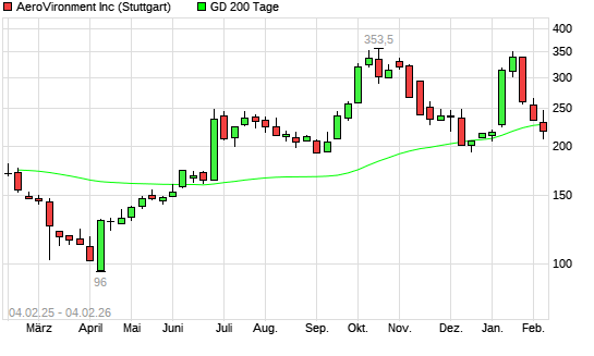 Mit dem Anstieg auf 234,10 EUR hat die AeroVironment-Aktie am 03.02.2026 die 200-Tage-Linie nach oben gekreuzt.