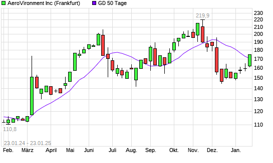 Mit dem Anstieg auf 168,20 EUR hat die AeroVironment-Aktie am 22.01.2025 die 50-Tage-Linie nach oben gekreuzt.