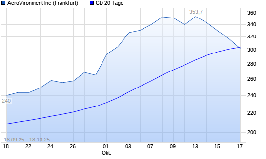 Mit dem Rücksetzer auf 302,20 EUR hat die AeroVironment-Aktie am 17.10.2025 die 20-Tage-Linie nach unten gekreuzt.