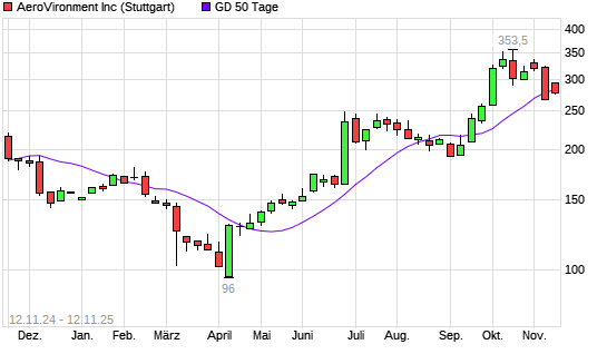 Mit dem Rücksetzer auf 279,10 EUR hat die AeroVironment-Aktie am 11.11.2025 die 50-Tage-Linie nach unten gekreuzt.