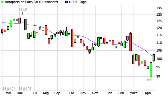 Mit dem Anstieg auf 104,00 EUR hat die Aeroports de Paris-Aktie am 17.04.2025 die 50-Tage-Linie nach oben gekreuzt.