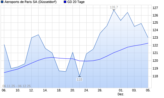 Mit dem Rücksetzer auf 122,70 EUR hat die Aeroports de Paris-Aktie am 05.12.2025 die 20-Tage-Linie nach unten gekreuzt.Die Aeroports de Paris-Aktie befindet sich seit dem 04.08.2025 im ...weiterlesen