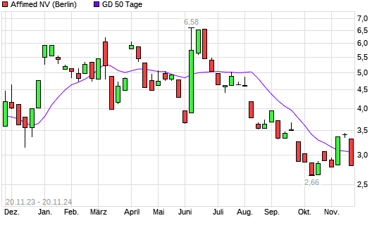 Mit dem Rücksetzer auf 2,95 EUR hat die Affimed-Aktie am 19.11.2024 die 50-Tage-Linie nach unten gekreuzt.