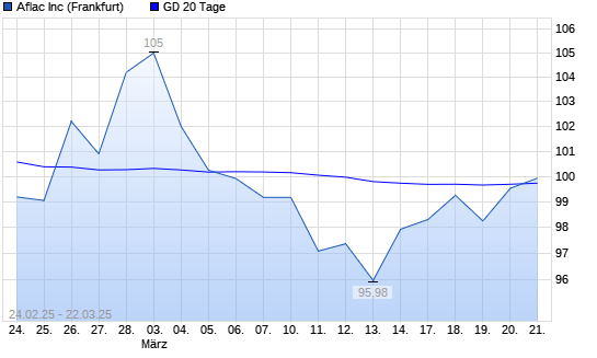 Mit dem Anstieg auf 99,94 EUR hat die Aflac-Aktie am 21.03.2025 die 20-Tage-Linie nach oben gekreuzt.