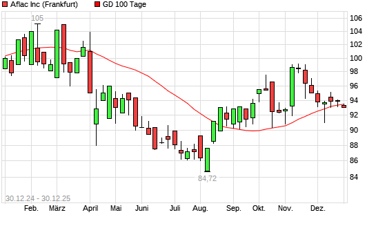 Mit dem Rücksetzer auf 93,38 EUR hat die Aflac-Aktie am 29.12.2025 die 100-Tage-Linie nach unten gekreuzt.Die Aflac-Aktie befindet sich seit dem 12.12.2025 im langfristigen Aufwärtstrend ...weiterlesen
